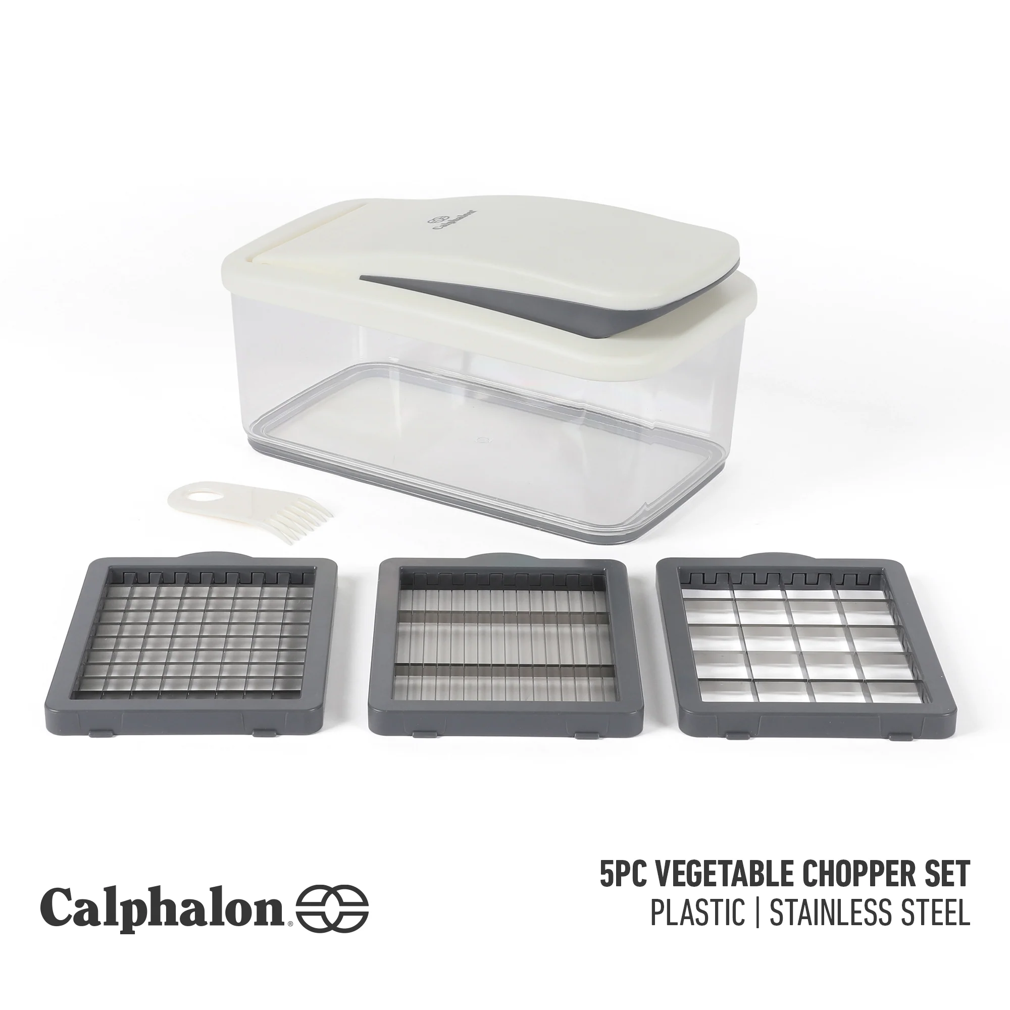 Food prep should feel less like a chore and more like part of the joy of cooking. With the Calphalon® Aero 5-Piece Vegetable Chopper, all the essentials you need for precise slicing and cutting are right within your reach. Swift, sharp, and efficient, this versatile set gives you interchangeable blades in three precise sizes (6mm, 12mm, 23mm), so whether you’re prepping a rustic salad, a layered gratin, or an appetizer platter, your dishes look as professional as they taste. It comes with a clever little cleaning brush sweeps away any residue from the lid's grid.