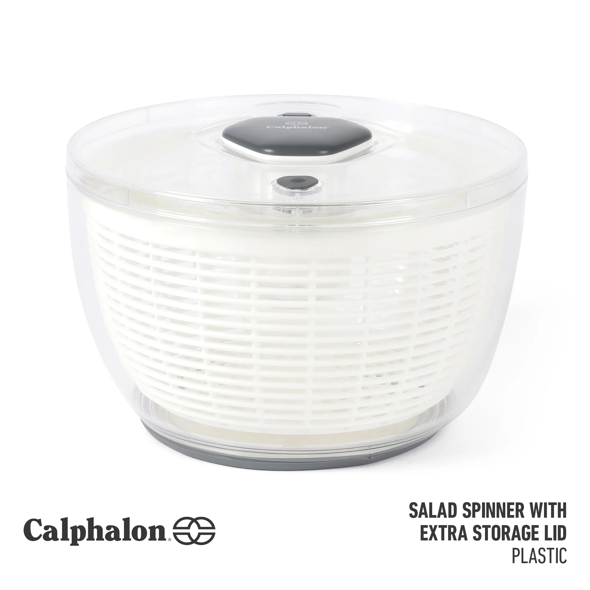 Press for freshness. Skip the painstaking task of washing lettuce leaf by leaf—the Calphalon® Aero Salad Spinner makes it quick and effortless to clean and dry greens. The large clear bowl holds the spinner basket, powered by an easy-press pump that triggers a swift spinning action. This process removes the excess water to keep salads crispy, never soggy and always ready for dressing. With a quick press of the brake button, the basket comes to a fast, controlled stop.