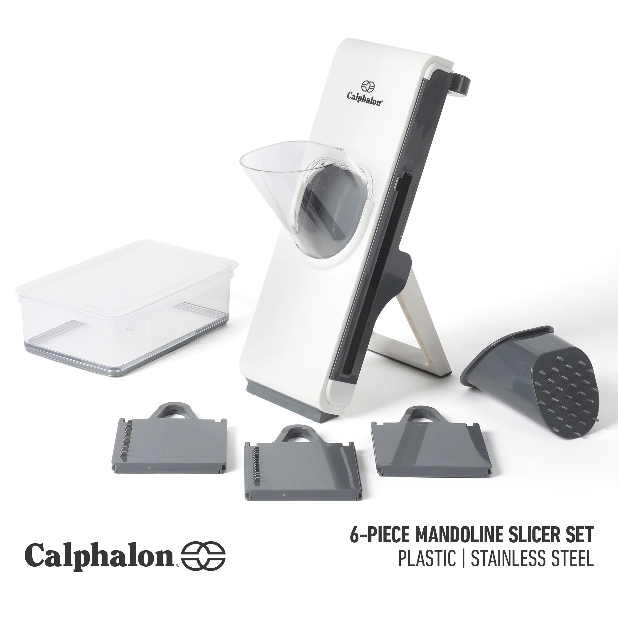 - This mandoline set includes interchangeable slicing blades, one chute, one stand and one plastic food container with lid.