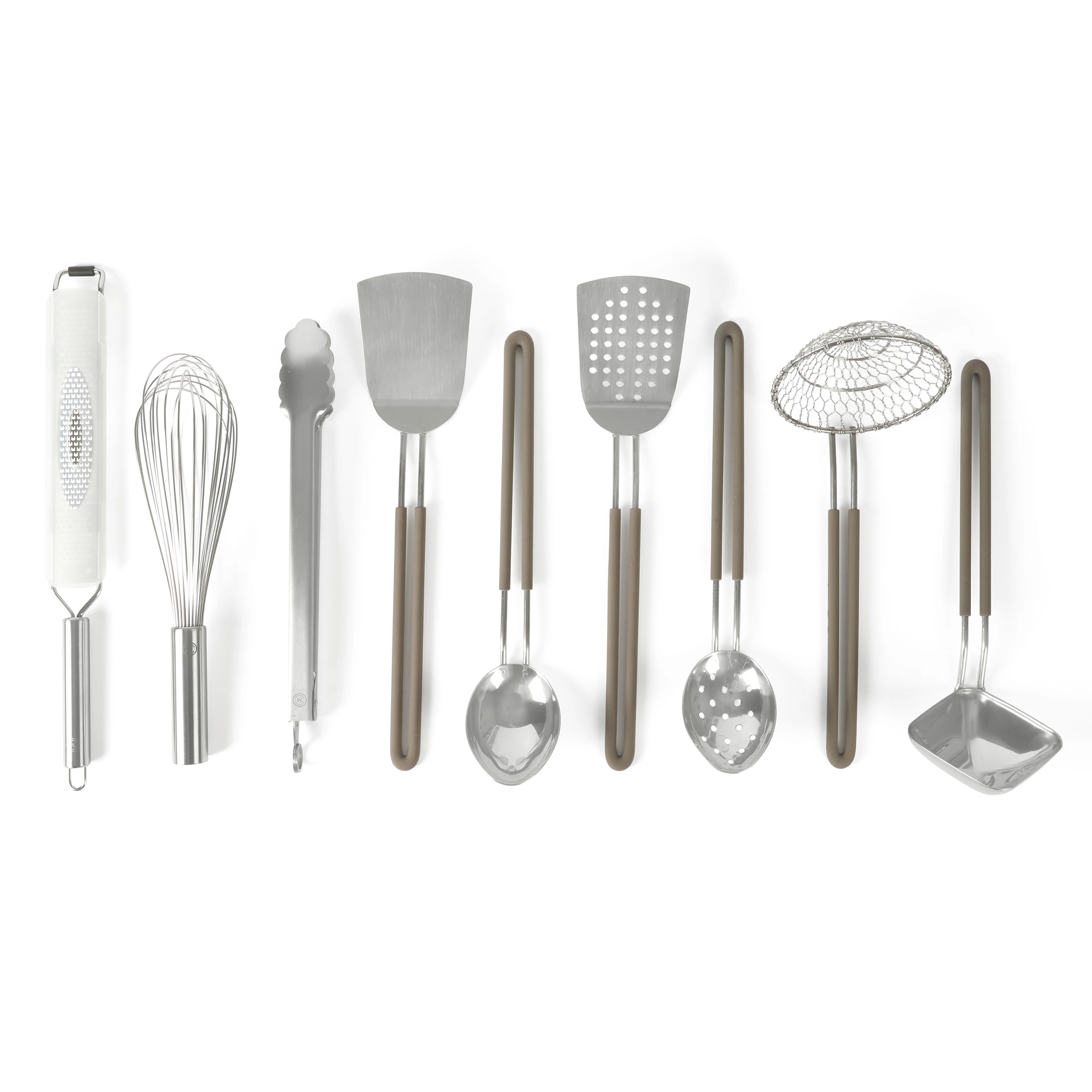 - WHAT'S IN THE BOX: One spider strainer, one rhombus ladle, one spoon, one slotted spoon, one turner, one slotted turner, one balloon whisk, one long grater, and one pair of tongs