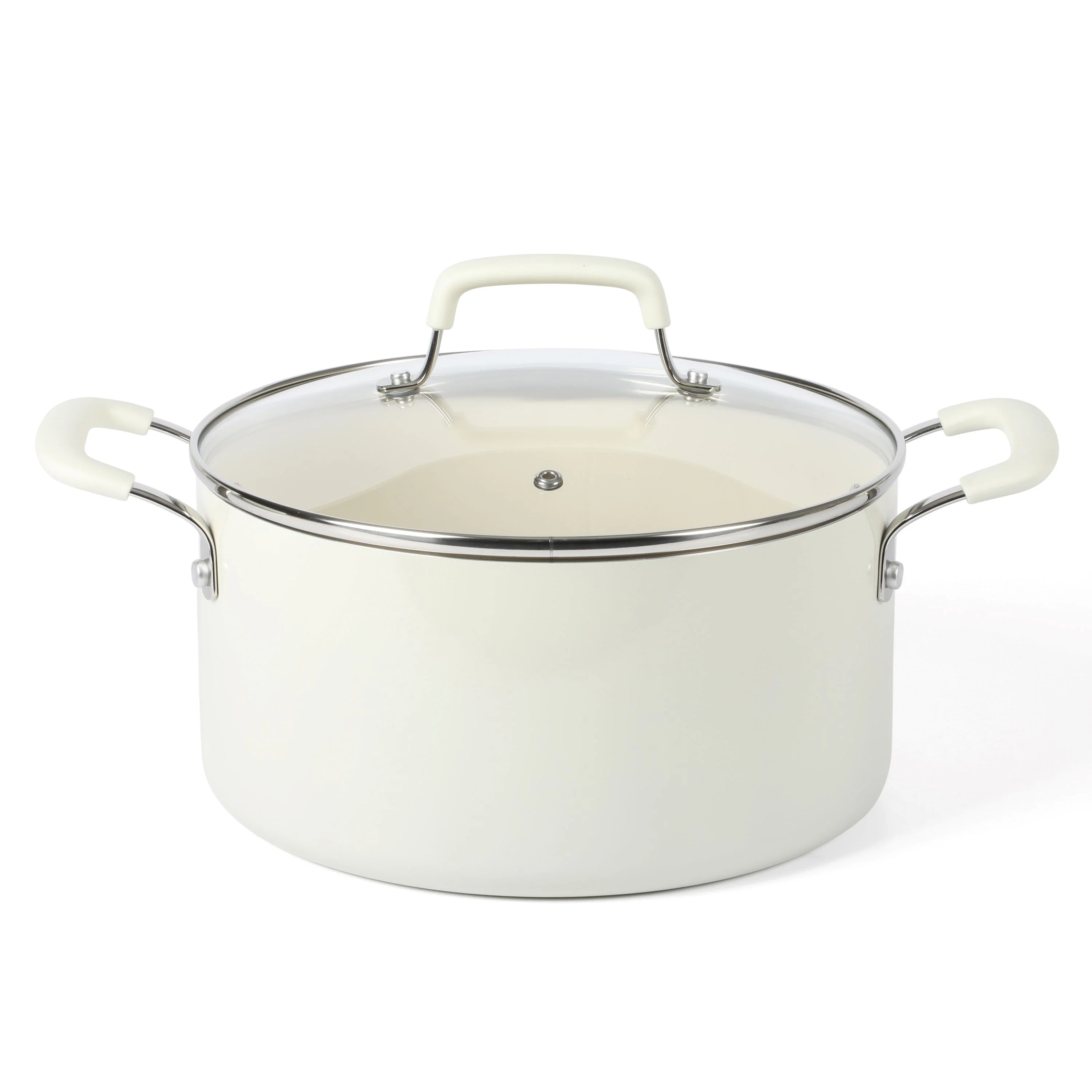 A beautiful collection of cookware and bakeware essentials, the Everyday by Martha Stewart Charlemont 12-piece Aluminum Cookware Set offers utility and charm for a joyful cooking experience. The set includes classic pots, pans, a cake pan, a baking sheet, and kitchen tools - all the kitchen essentials a home cook needs, but with a twist! Crafted from forged aluminum, each pot and pan is beautifully coated with a vibrant exterior finish to add a pop of color to your stovetop. Forged aluminum cookware ensures even heat distribution for no-hotspot results and provides extra strength to outlast the rigors of everyday cooking. Made without PFOA, lead, or cadmium, the ceramic nonstick interior offers a healthier style of cooking, smooth food release, and easy cleanup. Riveted Bakelite handles offer a soft and comfortable grip that stays cool to the touch. The stainless steel flame guard helps contain the flame to avoid burning the sides of the pan and the handle. Vented, tempered glass lid provides visibility to monitor cooking progress, while locking in moisture and helping prevent boil-overs. The set comes with one carbon steel cake pan and one carbon steel baking sheet to bake pastries as desserts or roast vegetables as side dishes. Solid wood tools provide a sturdy grip when stirring, scooping, and serving. They are safe to use on nonstick surfaces without leaving any scratches or damage. Dishwasher safe, hand wash recommended.